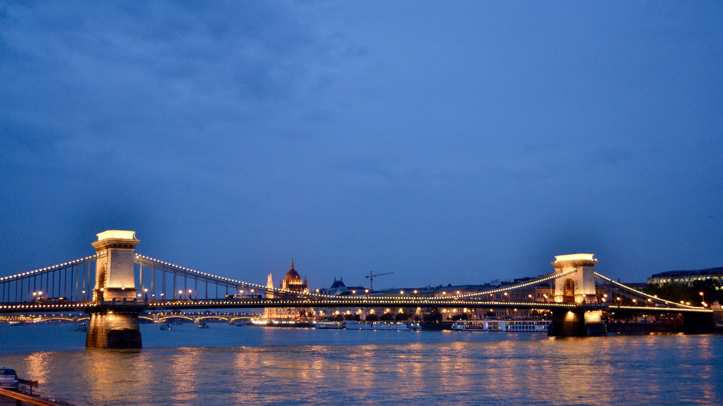 Budapest Széchenyi Chain Bridge at night with Budapest Parliament in the distance.